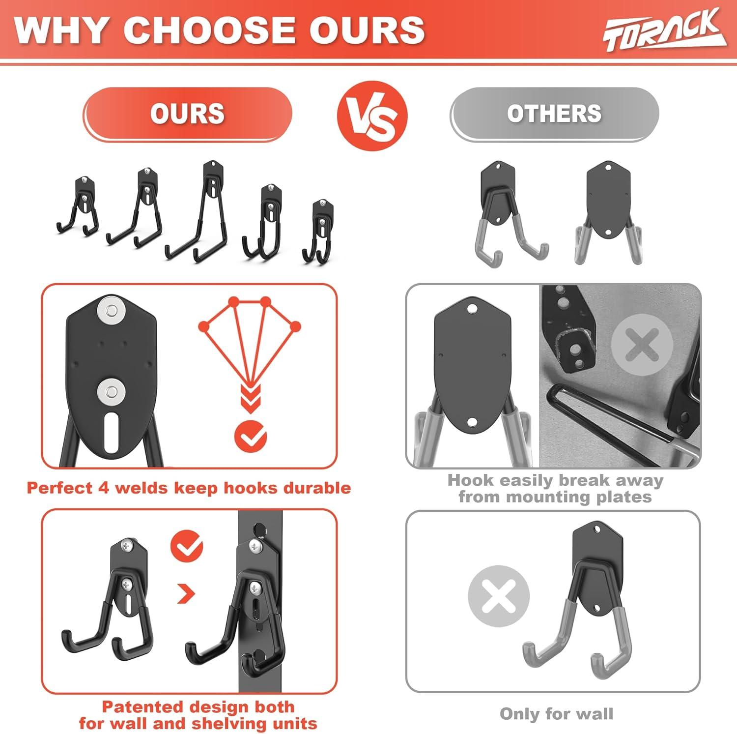 Simple Installation – These garage wall hooks can be easily mounted on walls or keyhole shelving units. With vertical screw holes for attachment to wall studs and compatibility with 1.5″ spaced keyhole slots in shelving unit legs, no special tools or hardware are needed. Just screw them in place and organize your space effortlessly.