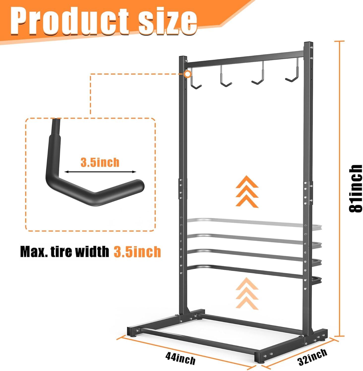 Built-In Adjustable Hooks: Features 7 heavy-duty bike hooks on the horizontal bar and 7 helmet hooks on the vertical bar. Each slip-resistant hook supports up to 60 lbs for secure, stable storage