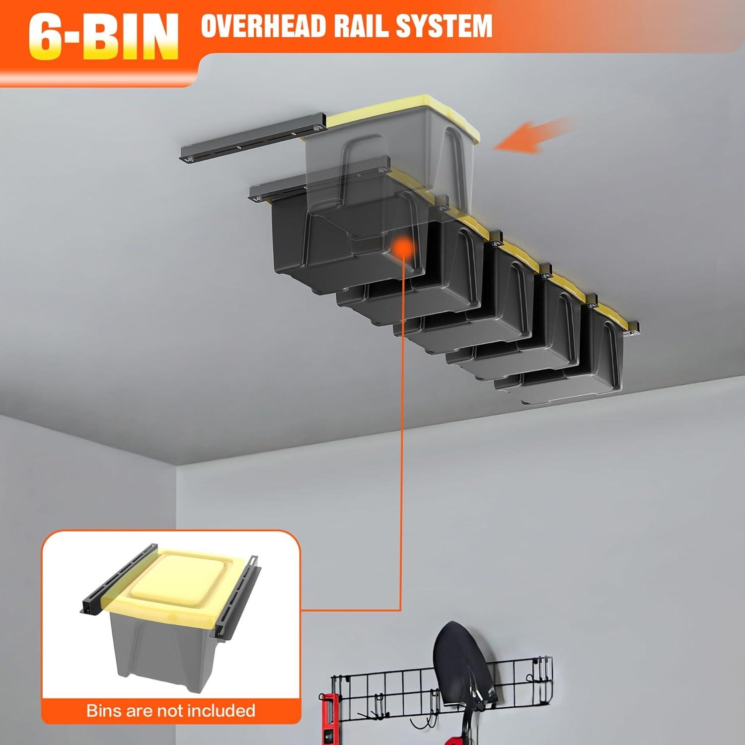 Smart and Reliable Storage Solution: Designed for lasting performance, this ceiling-mounted storage bin rails maximizes overhead space, making garage organization simple and efficient