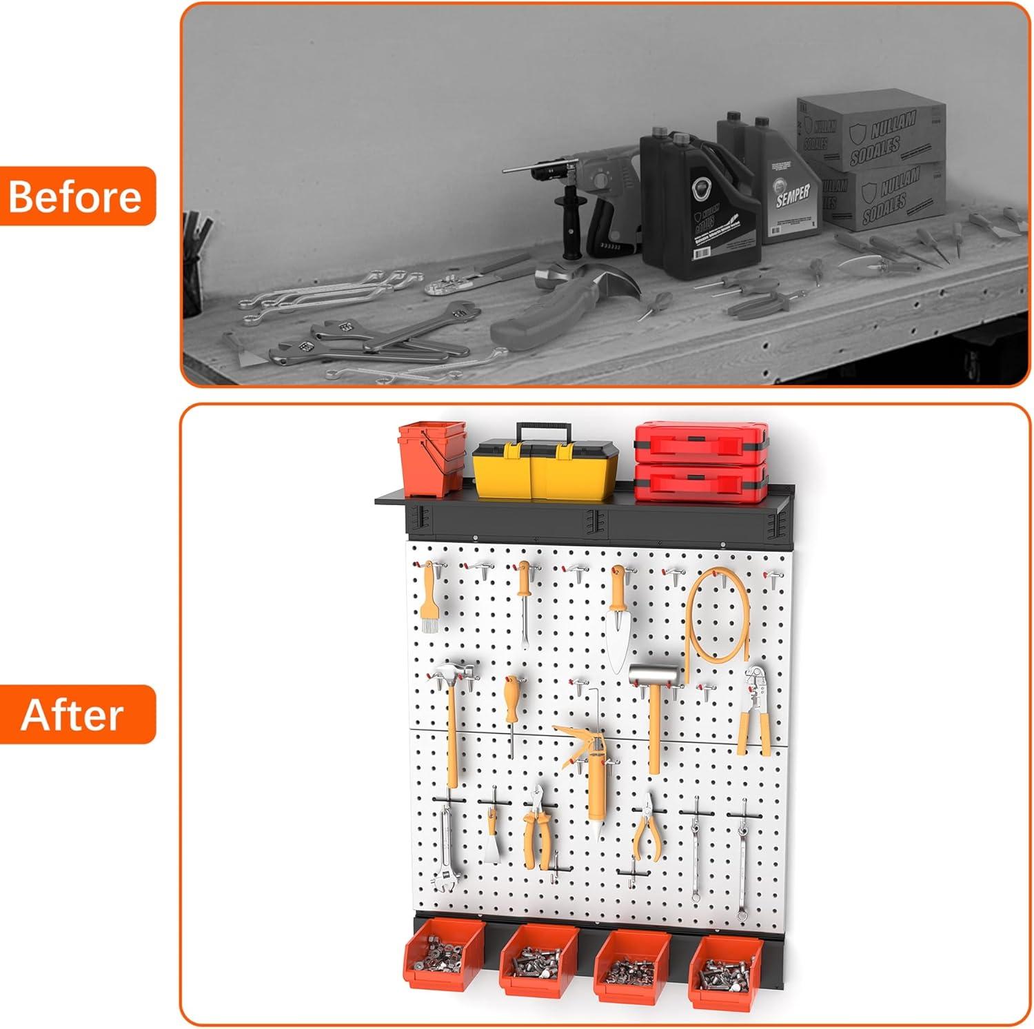 Great for Tools Organization: If you have plenty of items are just sitting loose on the workbench or been tired of digging around in a tool box which is small, this pegboard is the perfect solution