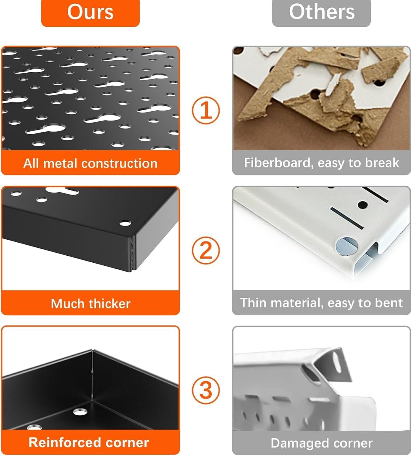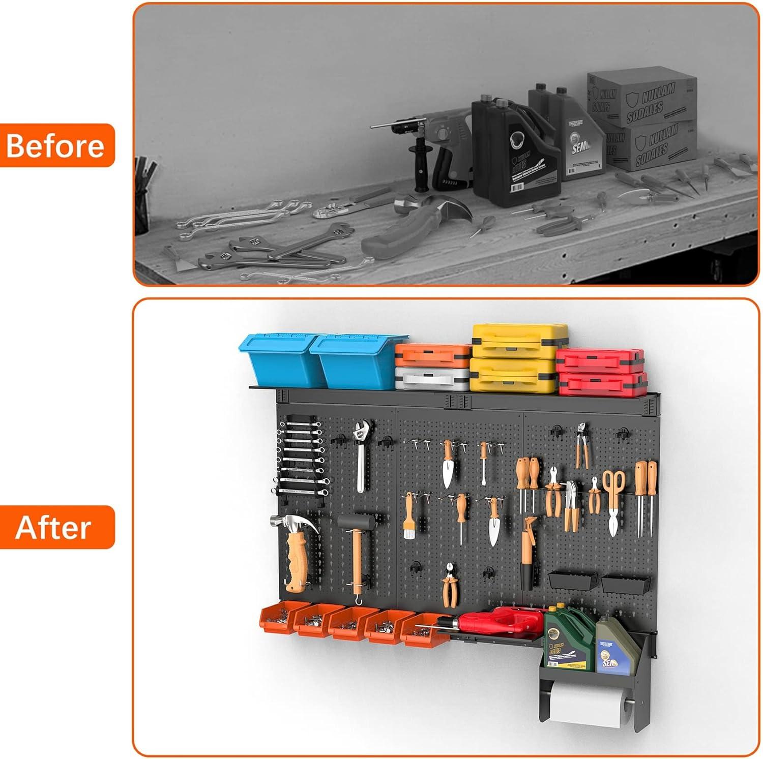 Most versatile metal pegboard wall organizer storage system. Organizes your garage, workbench, workshop, and keep your tools organized. Pegboard with durable powder-coated finish prevents rust and cracking. The edge folded thickness of the pegboard is 5/8″, keeps the pegboard hooks separated from the wall and will not scratch the wall