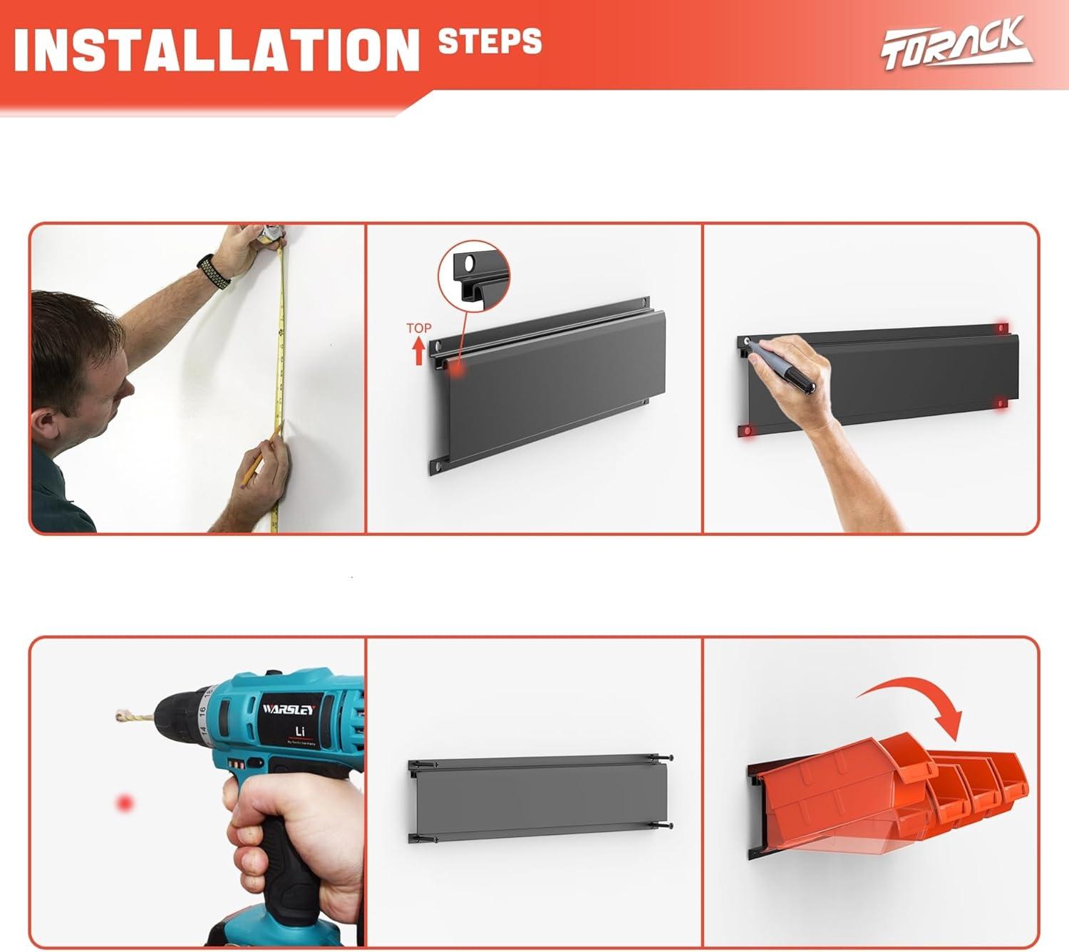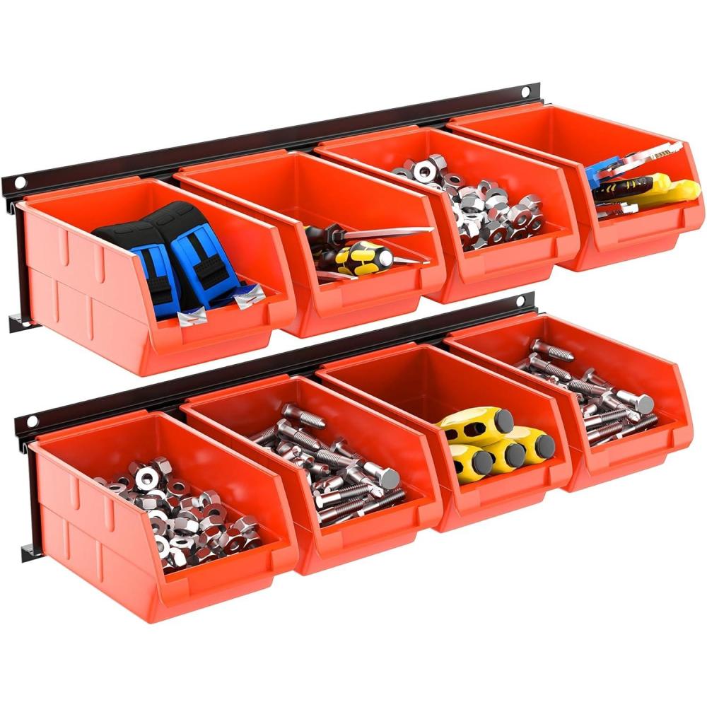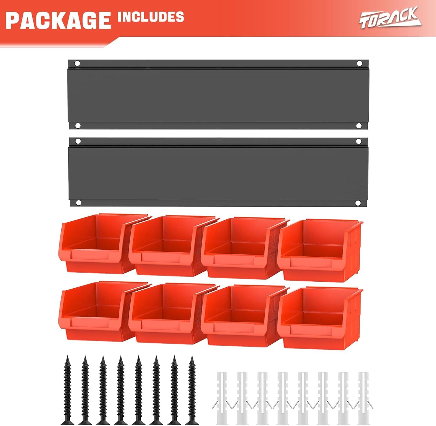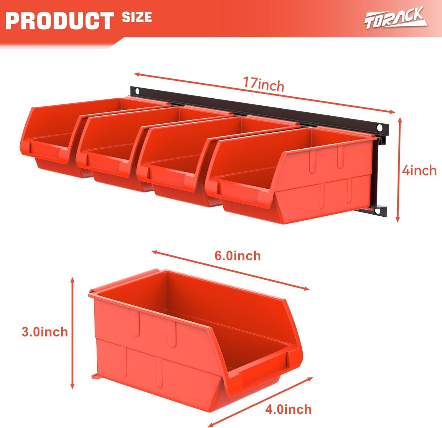 TORACK Wall-Mounted Storage Bins, 16 Plastic Bins for Tools Organization in Garage, Craft Room, and Shop(4-Pack, Blue)(Orange-red)